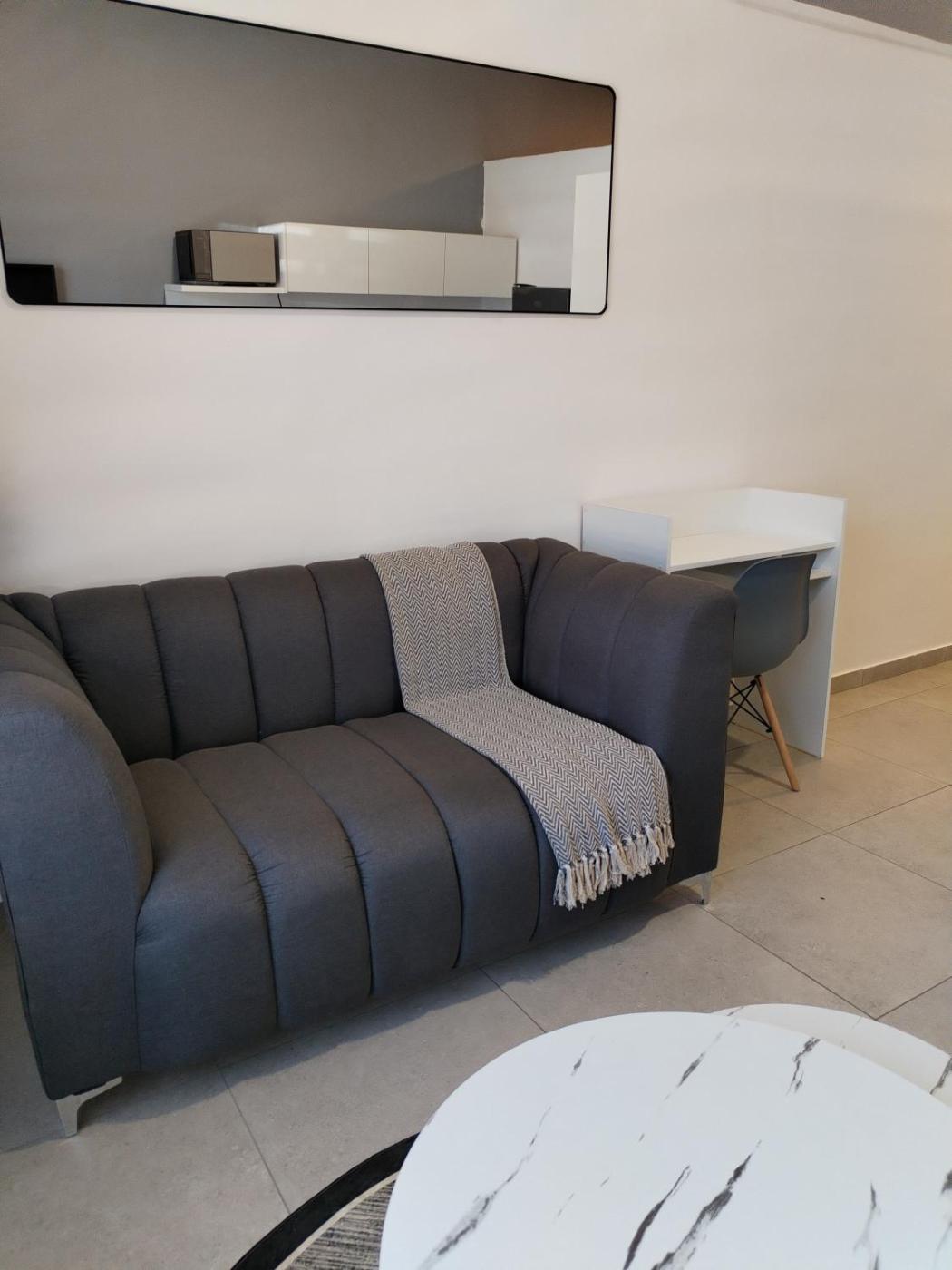 The apartment is composed of 1 bedroom, a fully equipped kitchen, and 1 bathroom. A flat-screen TV is featured.