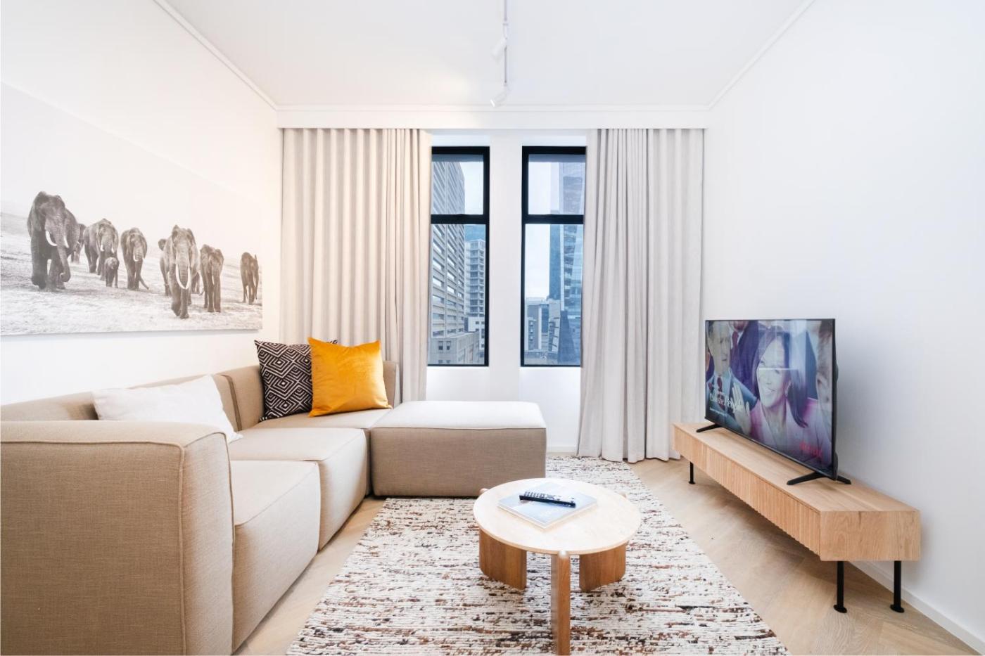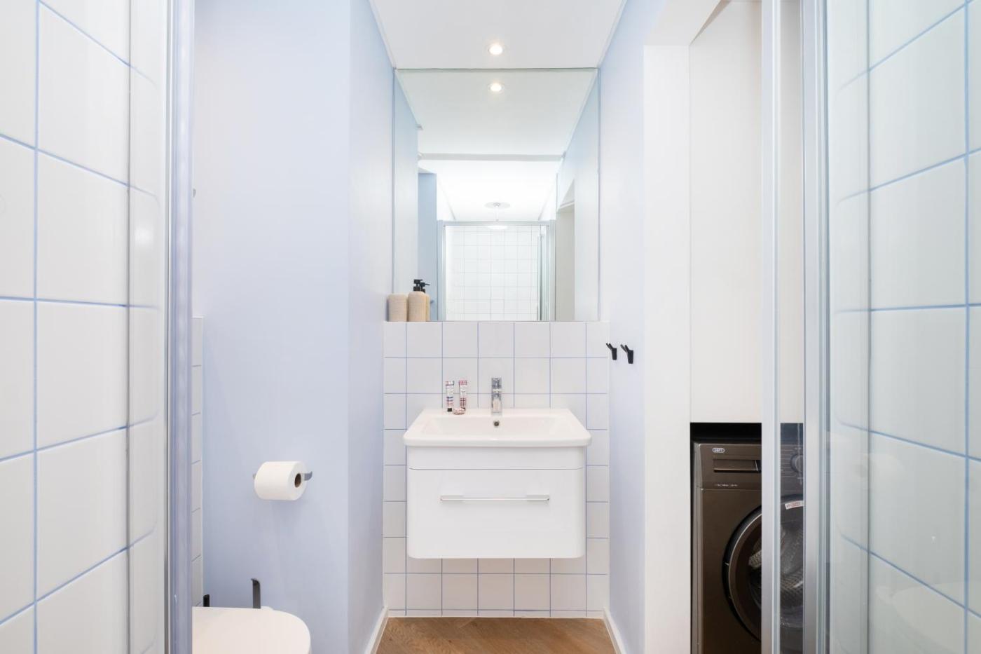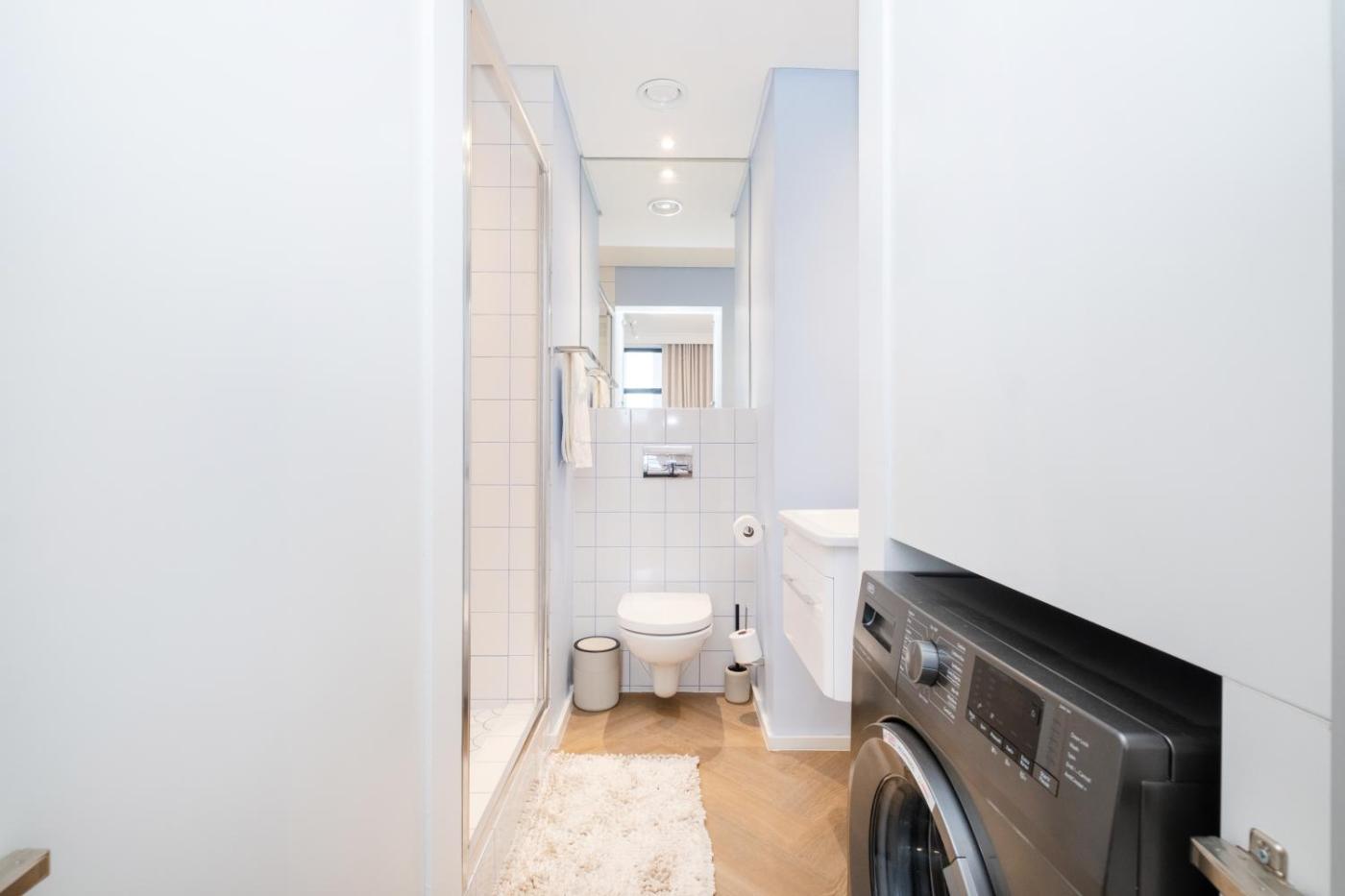 One-Bedroom Apartment. The air-conditioned apartment has 1 bedroom and 1 bathroom with a walk-in shower and a hairdryer. The well-fitted kitchen features a stovetop, a refrigerator, a dishwasher and kitchenware. The apartment features a flat-screen TV with streaming services, a washing machine, a coffee machine, a seating area as well as city views. The unit has 1 bed.