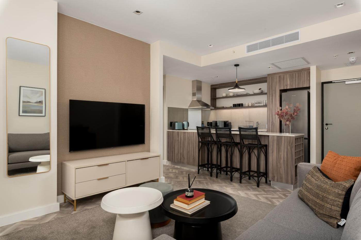 One-Bedroom Apartment. This apartment consists of 1 living room, 1 separate bedroom and 1 bathroom with a shower and free toiletries. Guests can make meals in the kitchen that is equipped with a stovetop, a refrigerator, kitchenware and an oven. The air-conditioned apartment provides a flat-screen TV with streaming services, a washing machine, executive lounge access, a coffee machine as well as city views. The unit offers 1 bed.