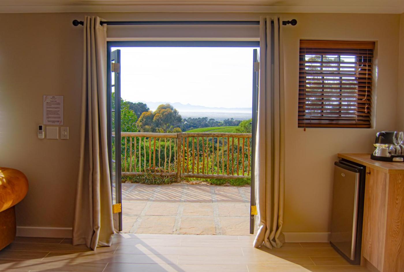 Double or Twin Room with Balcony - Nguni. This double has a patio with stunning view of the garden, False Bay and the mountains in the distance. It has a smart TV with streaming services and includes tea-and-coffee-making facilities. The en suite bathroom is fitted with a slipper bath, and includes free toiletries. ;