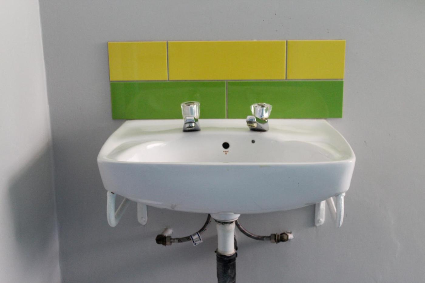 The hostel rooms are decorated in bright colours, and each have access to a wardrobe and a shared bathroom.