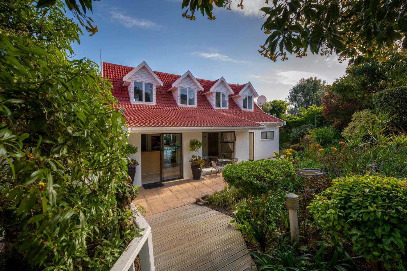 Suite. With stairs leading down to the ground level, this suite features a seating area, private entrance and a patio area overlooking the garden and the lagoon to the East. It is equipped with a flat-screen TV, a fridge, microwave, cutlery and crockery. The en suite bathroom has a shower. ;