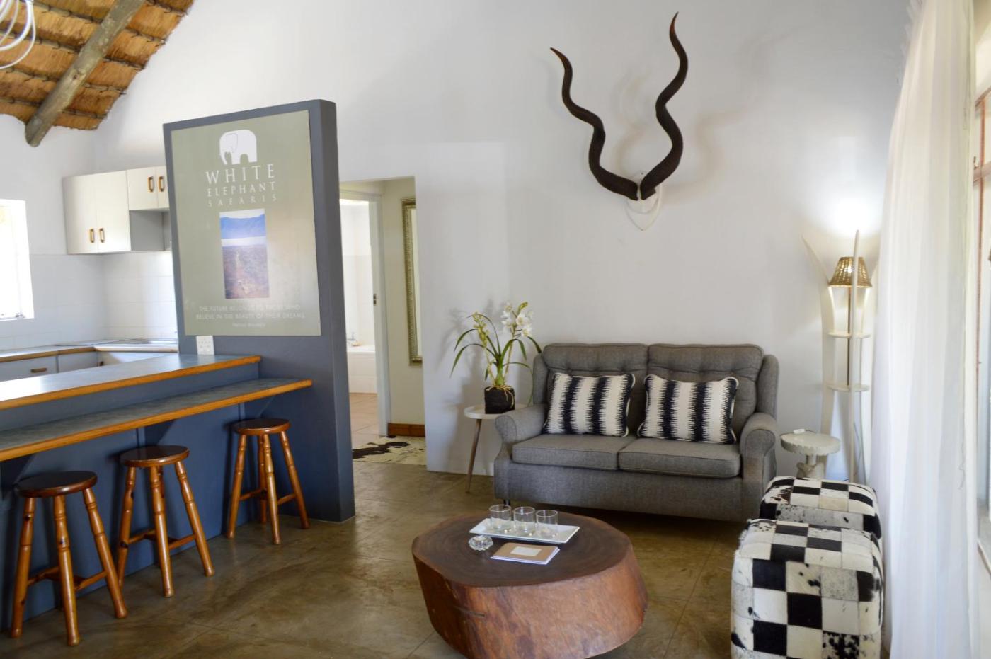 Equipped with facilities to self-cater, White Elephant Safaris provide guests with accommodationin either a two-bedroom cottage or a private bush camp. The private camp is comprised of 7 thatched en-suite chalets each with overhead ceiling fans. Guests can make use of the fully-equipped kitchen, dining room and swimming pool. The Two Bedroom Cottage is on its own and offer guests privacy with a large veranda and open plan kitchen.