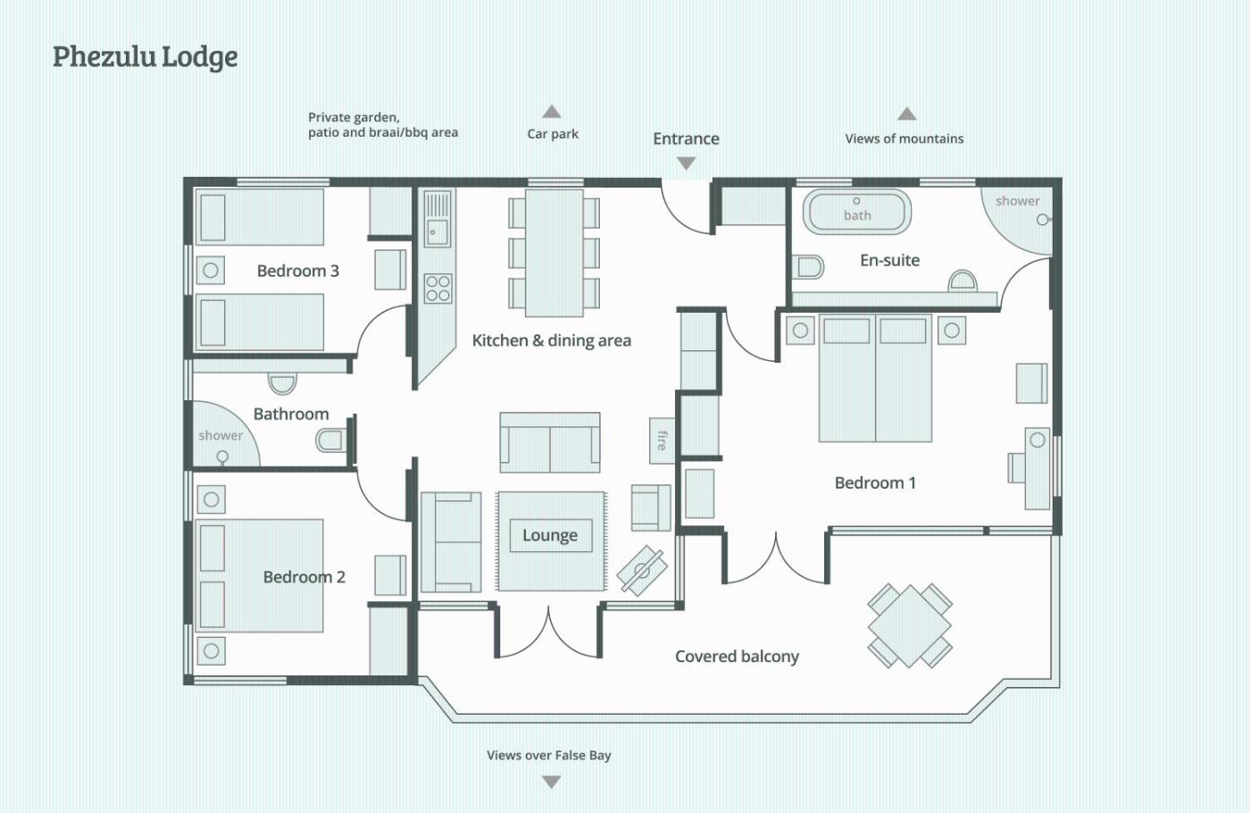 Luxury Queen Room. Located on the ground floor of the Guest house, the luxury Queen B&B rooms comprise a compact bedroom with lounge area and an en-suite private bathroom with shower over bath. The rooms open up onto the lawn with private patio and views over False Bay (Sea view). Each room is equipped with airconditioning, ceiling fan, WiFi, Internet TV and DSTV, tea and coffee making facilities, mini-bar. The lodge has a solar battery system and generator power for when we loose electricity from the national power grid. Situated on a 300hectare secure housing estate. No children - one queen size bed (160cm by 200cm). ;