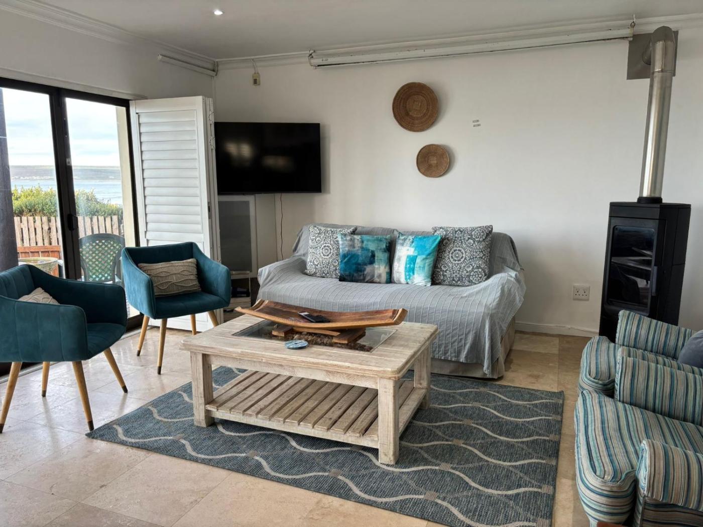 The living area leads onto a wooden deck with beautiful views of the ocean and an outdoor braai to enjoy those perfect moments.